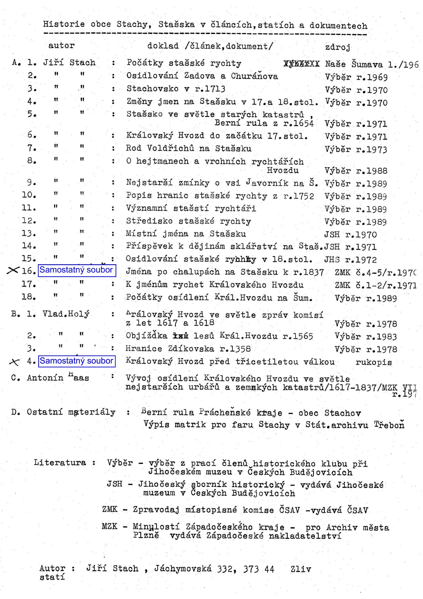 Historie obce Stachy, Stašska v článcích, statích a dokumentech
